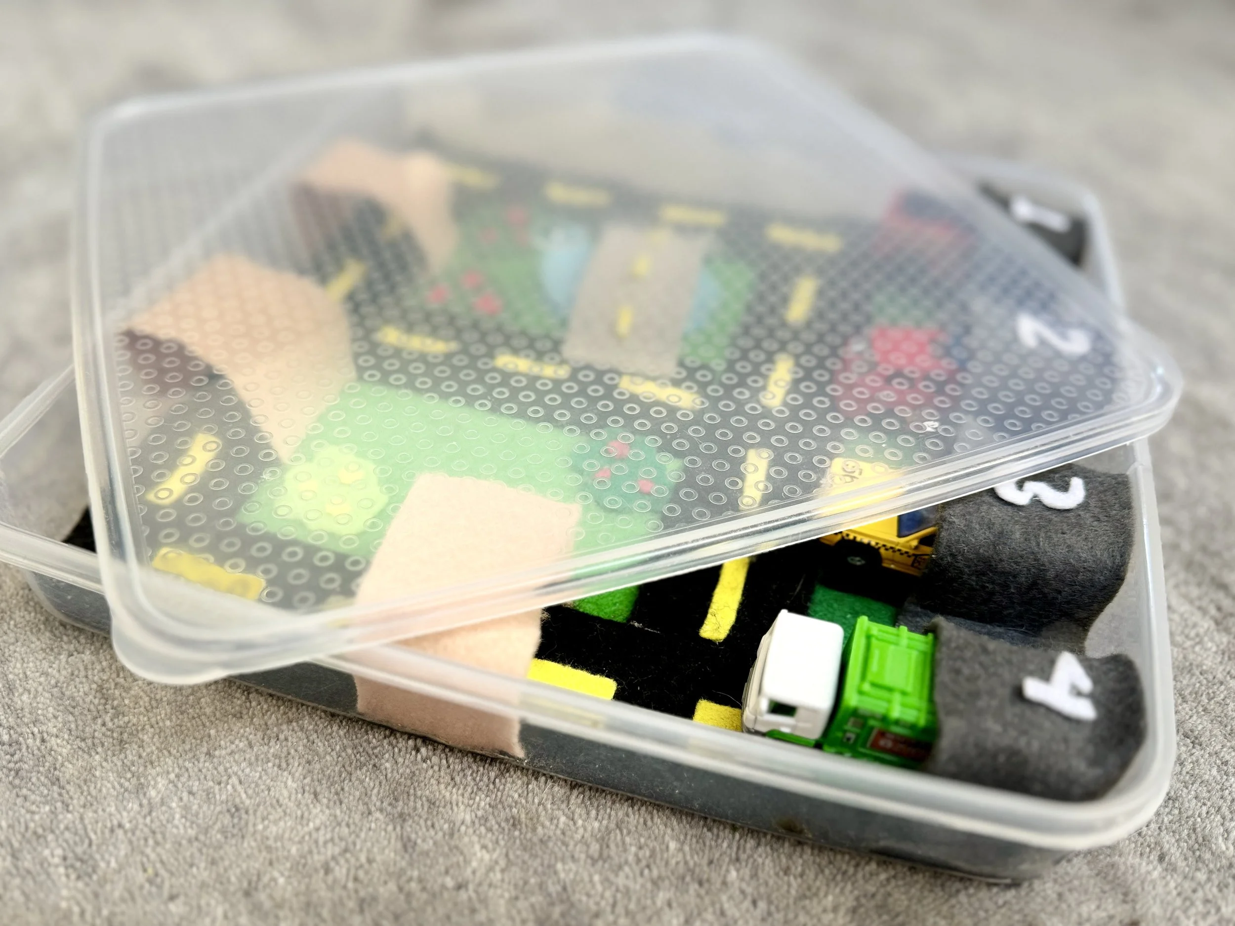 Solution: Create a travel roadway in a thin container! The container needs to be thin enough so cars won’t roll off. And the container needs to be carry-on and car seat friendly.