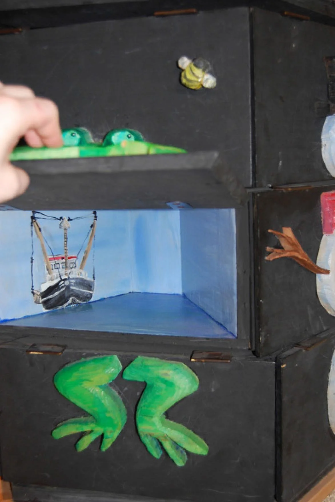 Each cubbie opens to reveal an imaginatve hand-painted scene.